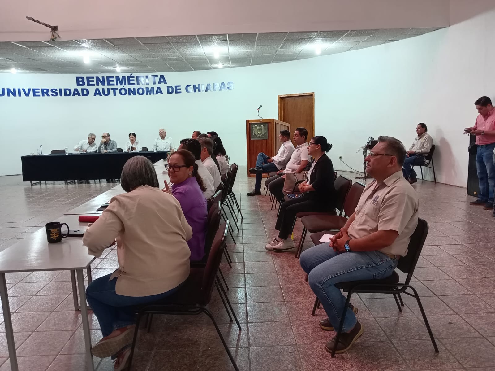 El acto protocolario reunió en la mesa del presidium al Rector de nuestra máxima casa de estudios, Dr. Oswaldo Chacón Rojas; al director de la Escuela de Sistemas Alimentarios, M.C. Pedro René Bodegas Valera; a la coordinadora general de Relaciones Interinstitucionales, Dra. Rocío Moreno Vidal; al Mtro. Juan Enrique Quintana Adriano; y a la secretaria general de la UNACH, Dra. María del Carmen Vázquez Velasco, así como a directores de las unidades académicas del Campus IV y personal de la SIAL-UNACH.